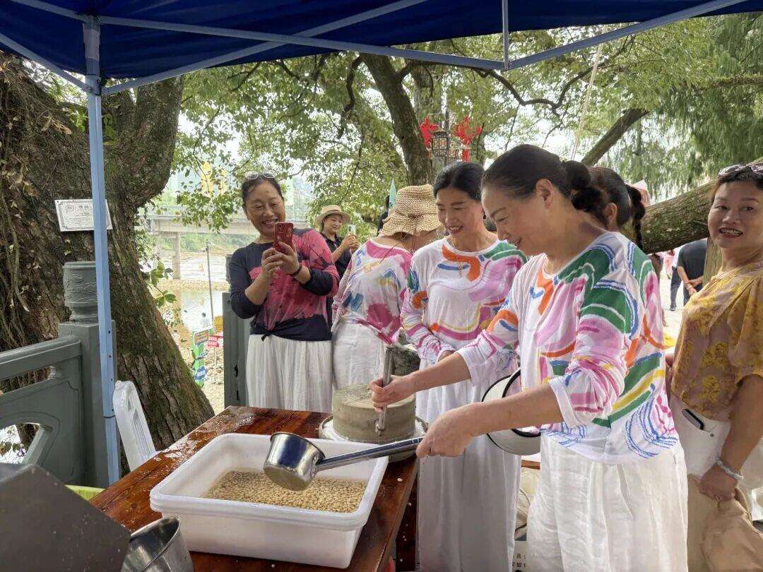 另一侧,石柱村文化礼堂门口同样热闹非凡,趣味“Jue青蛳”挑战赛吸引了大批游客驻足观看。选手们弯腰俯身,双手飞快地动作,青蛳壳“哗啦啦”掉落在碗边,引来观众一阵阵笑声和加油声。而一旁推石磨、喝豆浆的体验区也是人气火爆。来自宁波的游客吴昊在亲身体验了石磨后直呼:“太解压了!感觉一下子回到了以前的手工作坊,这种体验在城市里根本找不到。”