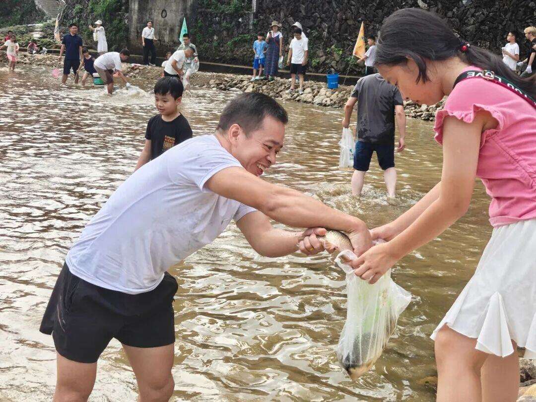 除了豆腐宴和“Jue青蛳”挑战赛,石柱村还准备了丰富多彩的配套活动。在村口广场上,游客们可以欣赏高跷竹马、狮象灯舞等非遗民俗表演,感受传统文化的独特魅力;在集市小摊上,琳琅满目的商品吸引不少人驻足挑选。另外,在溪水边还设置了皮划艇等水上游乐项目,供游客划桨嬉水,体验清凉畅快的假日时光。