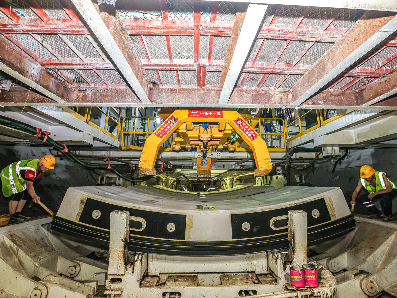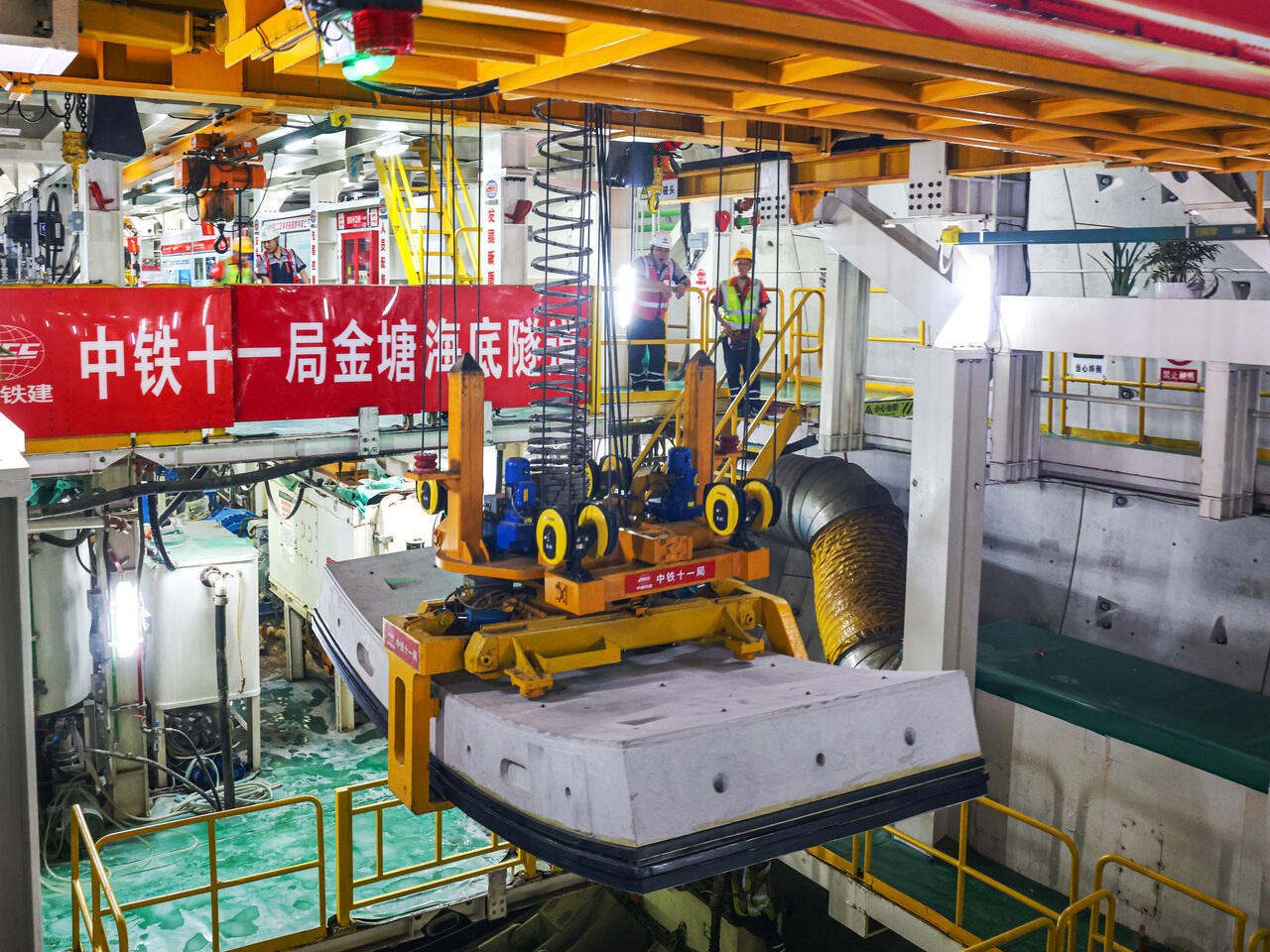 10月1日上午,海平面60米之下,世界最长海底高铁隧道——甬舟铁路金塘海底隧道的深处,依然是一片有序的繁忙。中铁十一局的170余名建设者选择坚守,以“节日我在岗,建设不停步”为信念,在金塘侧施工点上演着属于这个假期的“国庆加速度”。