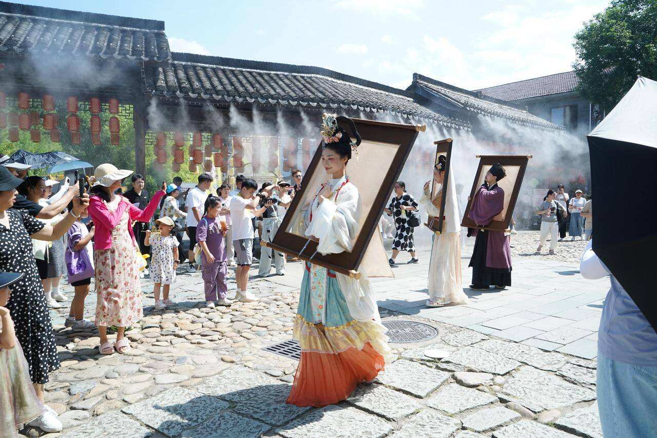 10月2日至6日,“丹青霓裳”国画巡游在古堰画乡旅游度假区精彩上演。巡游演员们以中国古代(南宋时期为主)工笔画《维摩居士图》《西园雅集图》《黄帝画像轴》《宫女团扇》中的人物为原型,精心考据经典画作,从妆容、服饰、仪态等方面深度复原与活化,让这些角色栩栩如生地走到游客身边。众多市民游客新奇不已,主动与“历史人物”近距离互动、合影,沉浸式体验这场趣味十足的文化盛宴。