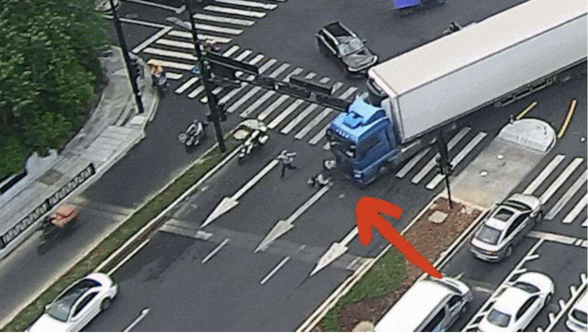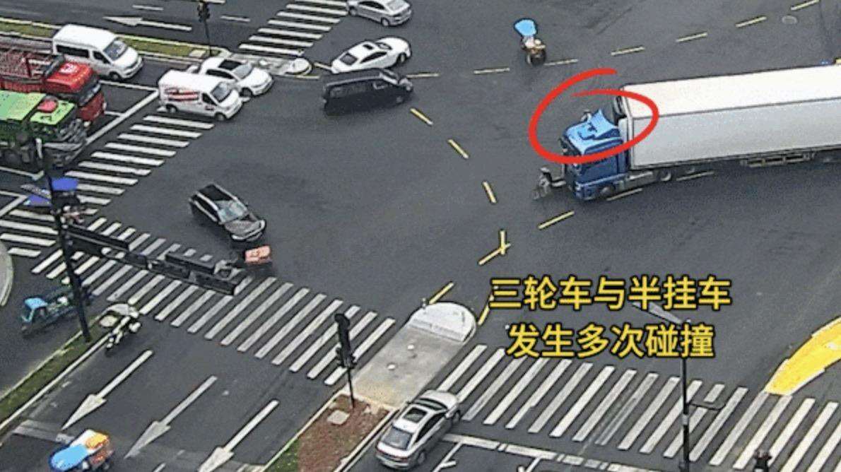就在这时,身后突然传来“砰”的一声闷响。刘明立即转头,只见一位老人骑着脚踏三轮车,径直驶入一辆正在左转的大型半挂车的视觉盲区。