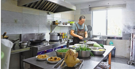吴锋正在为游客烹饪家乡美食。 共享联盟·越城 姜辰汐 摄