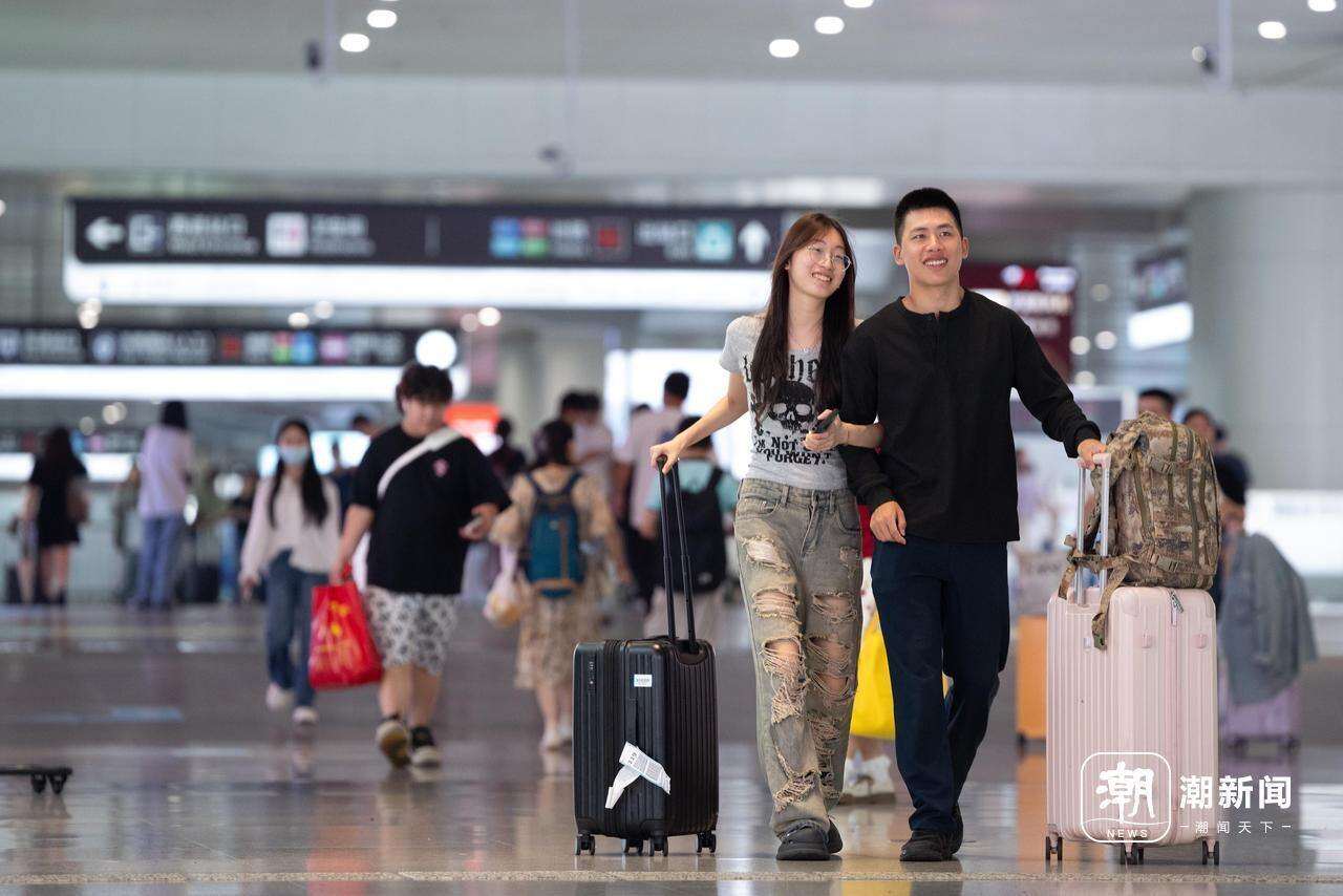 10月8日,杭州火车东站到达层迎来返程客流高峰,市民们拖着大包小包行李告别假期重回日常。记者 倪雁强 摄