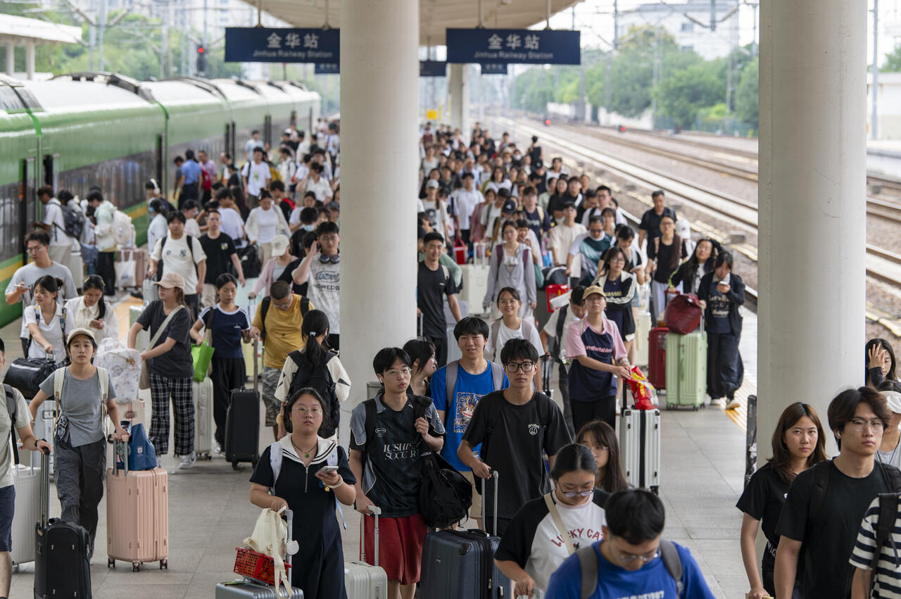 10月8日,金华市,旅客在铁路金华站站台上返程归来。拍友 胡肖飞 摄