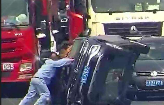 这一推一抱很温暖很中国!黑色小车侧翻有人员被困车内 高速交警和热心群众合力推车救人