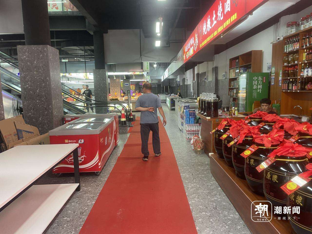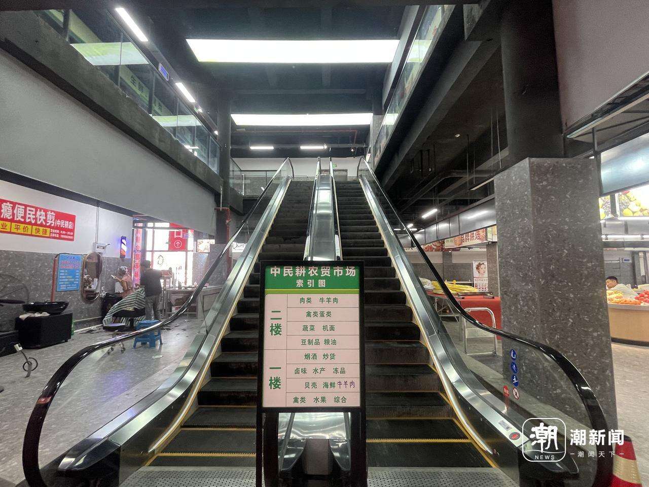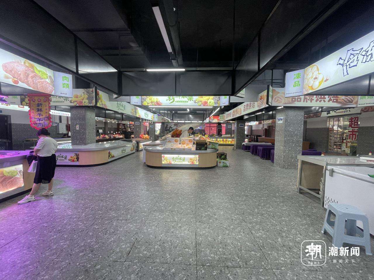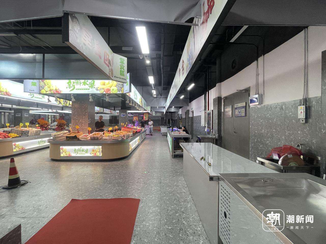 到底有多简陋?记者前往现场实地探访,内部装修的确称得上敷衍,货柜仅用铁架和塑料板材简易搭建而成,地面铺的是普通地砖。一楼和二楼全部商户加起来也仅10余家,主要经营蔬菜、肉类、水产、干货、水果、熟食等。记者现场目测,近半摊位空置。