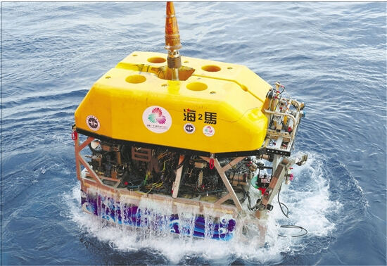 采集“源火”后,“海马”号深海遥控潜水器从海底返回,浮出水面(9月18日摄)。 新华社记者 卢汉欣 摄