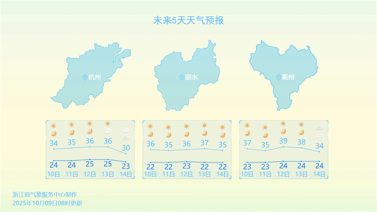 以杭州为例,如果这四天最高气温都越过35℃,那么杭州的高温总数将达到72天,比去年的历史纪录(61天)大幅度提高11天。杭州气象台昨天分析,较为乐观的情况是仅13日出现高温——这也意味着杭州将实现历史上10月中旬的首个高温天气,并将最晚高温日纪录(2022年10月3日)推迟10天。