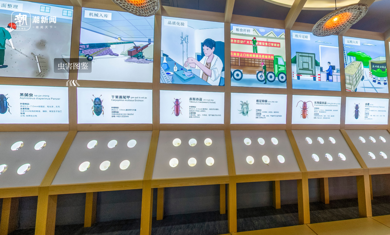 这里陈列着玉米象、谷蠹、粉螨等常见储粮害虫的标本,旁边的插画还生动展示了粮食入库的全过程:货车到库、检斤称重、扦样化验、机械入仓、平整粮面、熏蒸杀虫,每一步都清晰明了。