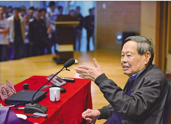 2014年4月14日,杨振宁在浙江大学演讲。 新华社发(龙巍 摄)