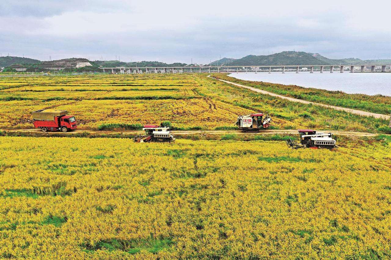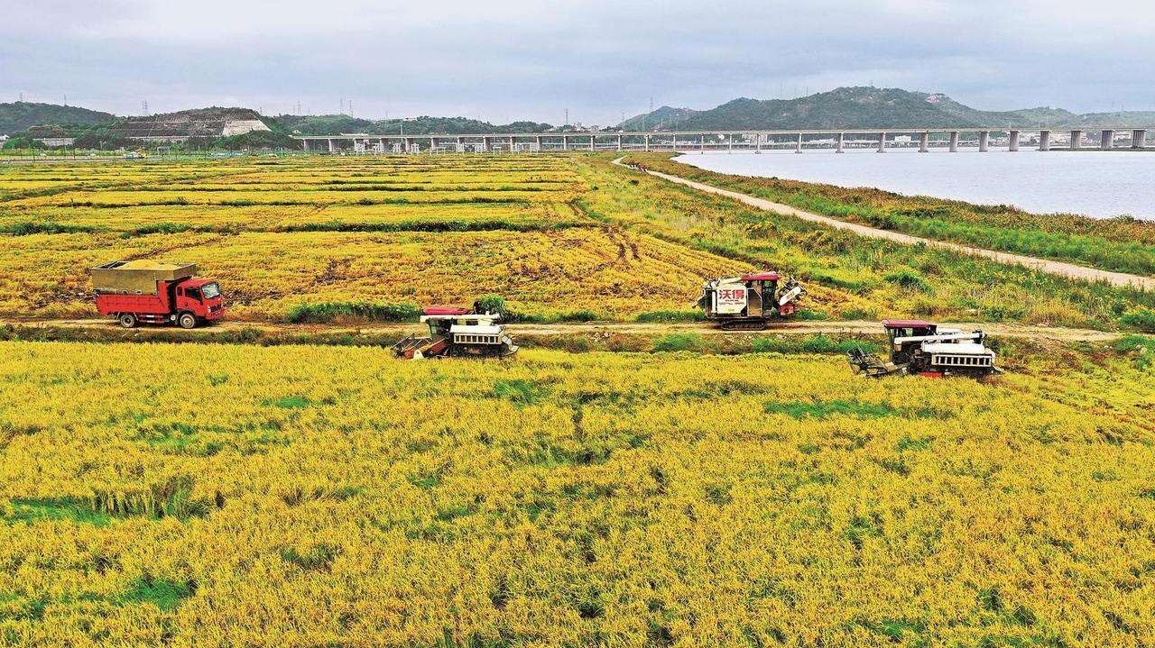 10月19日,玉环市漩门湾三期智慧农业示范基地内垦造改良后的盐碱地种植的“海水稻”迎来丰收,农民驾驶农机忙着收割稻谷。近年来,玉环市实施漩门湾垦造耕地工程,化滩涂为良田,引进不同型号种子,积极打造海水稻产业转型升级的样板。