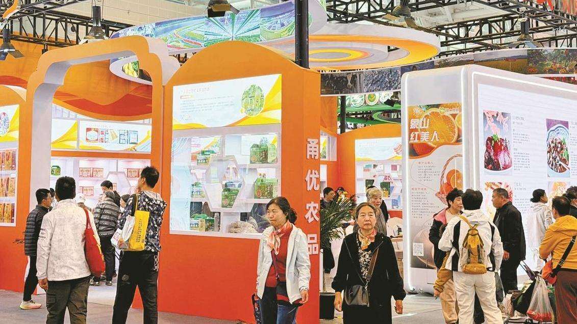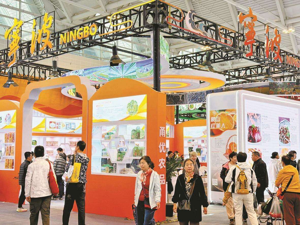 宁波综合展区内,“甬”字号农产品琳琅满目,不仅精选了象山柑橘、余姚榨菜、奉化水蜜桃等久负盛名的地理标志农产品,还集中展示了包括山茶油、千层饼、年糕、香榧等地方特色农产品及其深加工产品,全面呈现宁波“拥江揽湖、枕山面海”的资源禀赋与全产业链建设成效。