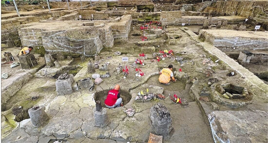 图为绍兴塔山和畅坊遗址考古现场,插小旗处为祭祀遗迹。 绍兴市文物考古研究所供图