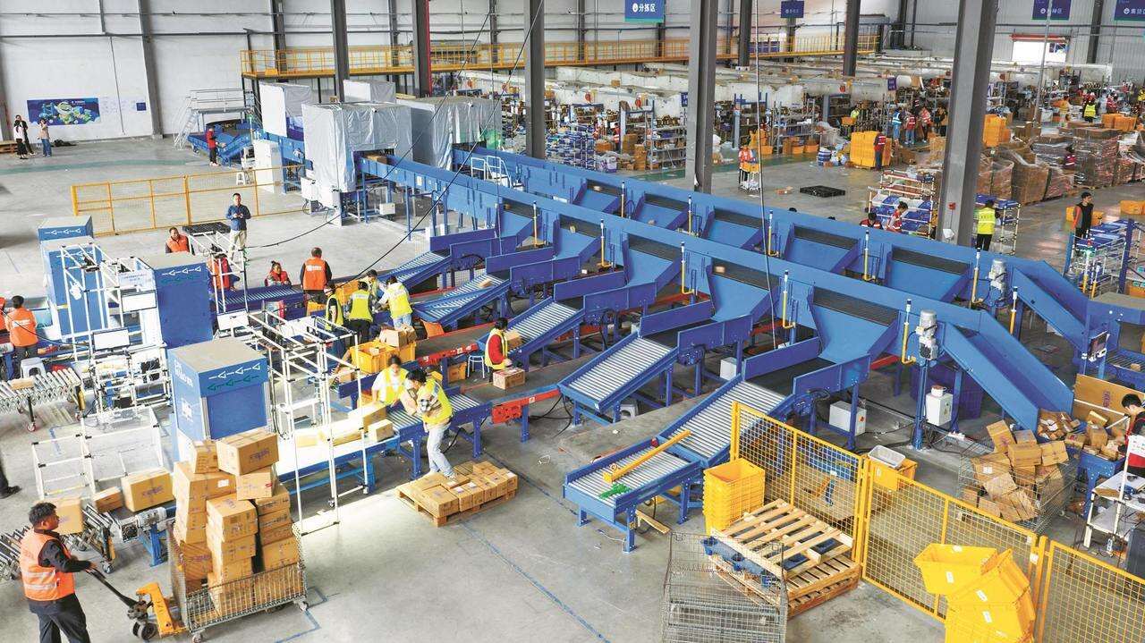 北仑港综合保税区菜鸟1号仓库内,数百名工作人员正紧张有序地进行理货、拣货、上架和打包作业。