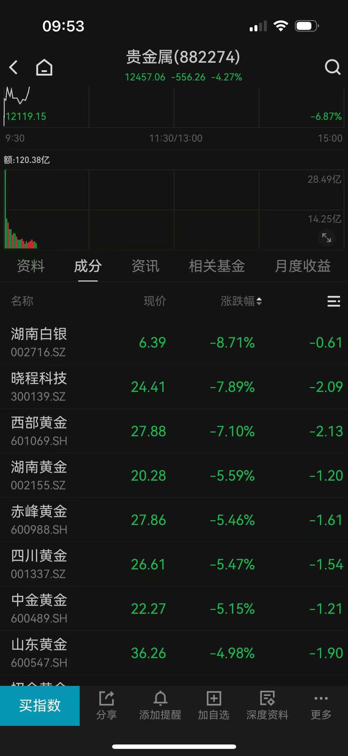 个股方面,湖南白银大跌近9%,晓程科技、西部黄金等个股跌超7%。