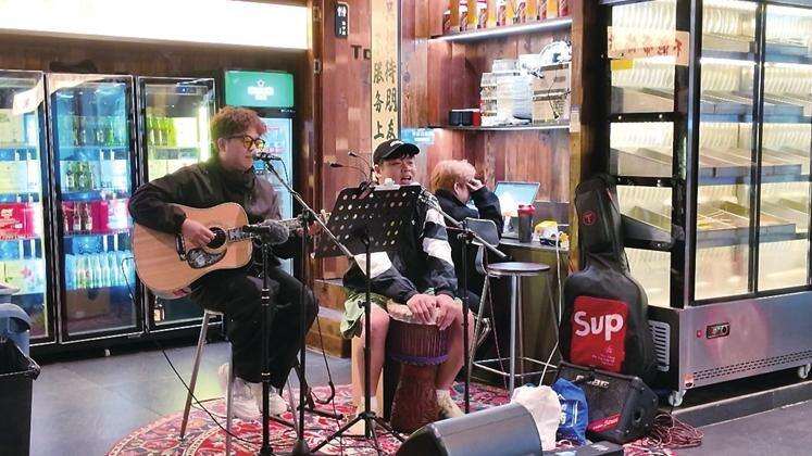 烧烤店内的民谣现场演出。记者 倪晶 摄