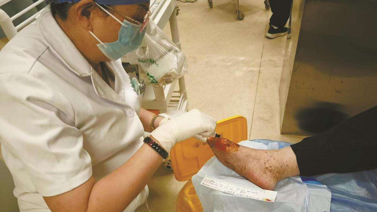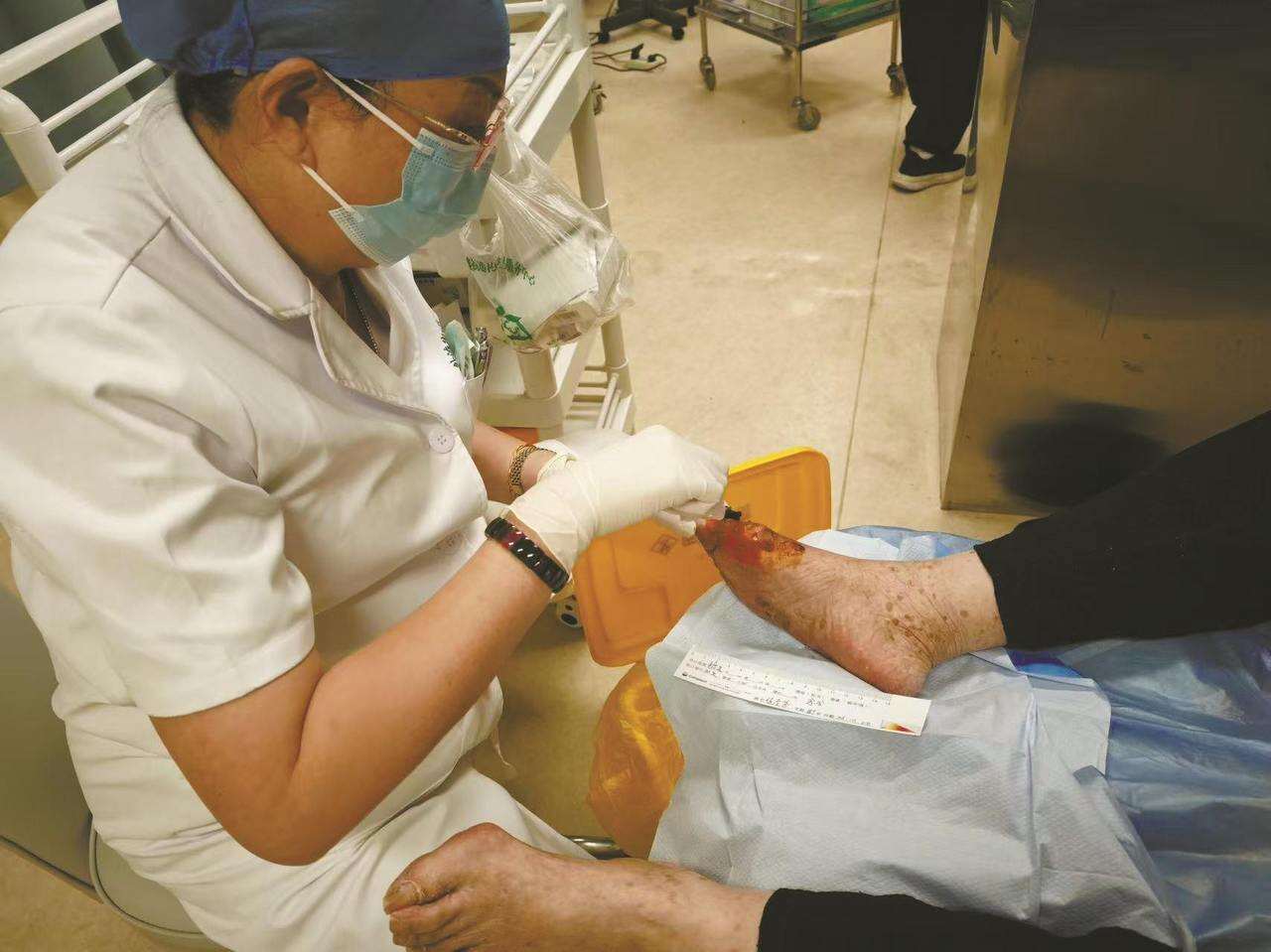 “张阿婆的糖尿病足已发展到第三级,溃烂侵犯至筋膜和骨骼。起初一个脚趾,后来蔓延到两个大脚趾和第四趾。烂得比较深,都看得到骨头了。”陈谦回忆,“每一次清创,老人都痛得哇哇大叫,我们一边治疗,一边安慰她,尽可能地减轻她的疼痛。”