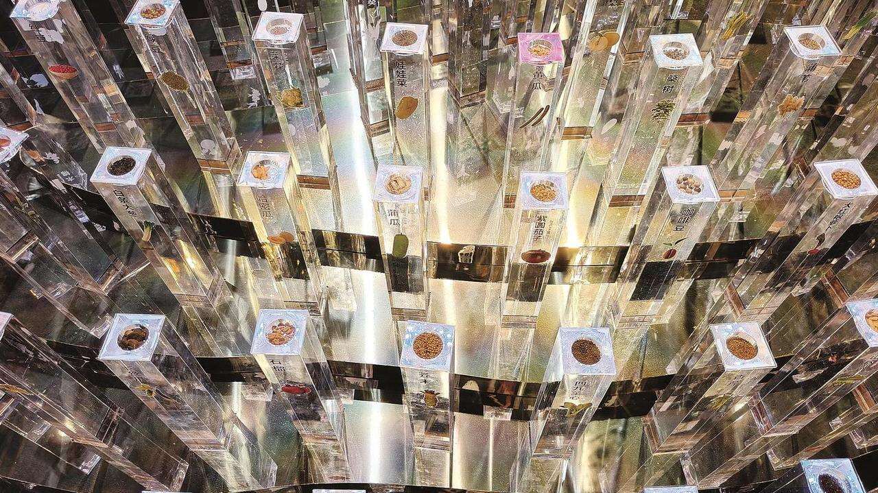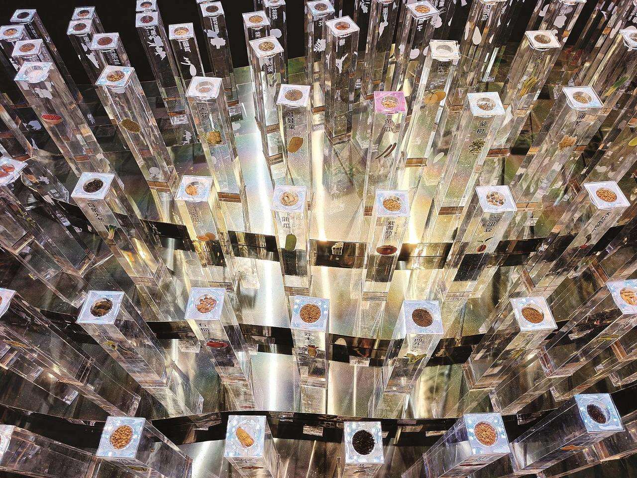 紧挨着农耕展区的,是种子厅。菜场上见到的、或是水果店买到的瓜果蔬菜,它们的种子到底长什么样?秋葵、娃娃菜、蒲瓜、花生……这些种子被放置在透明的容器里,游客可以凑近了去细看。不同的种子下方都配有图片,是它们长大后的样子,一目了然。
