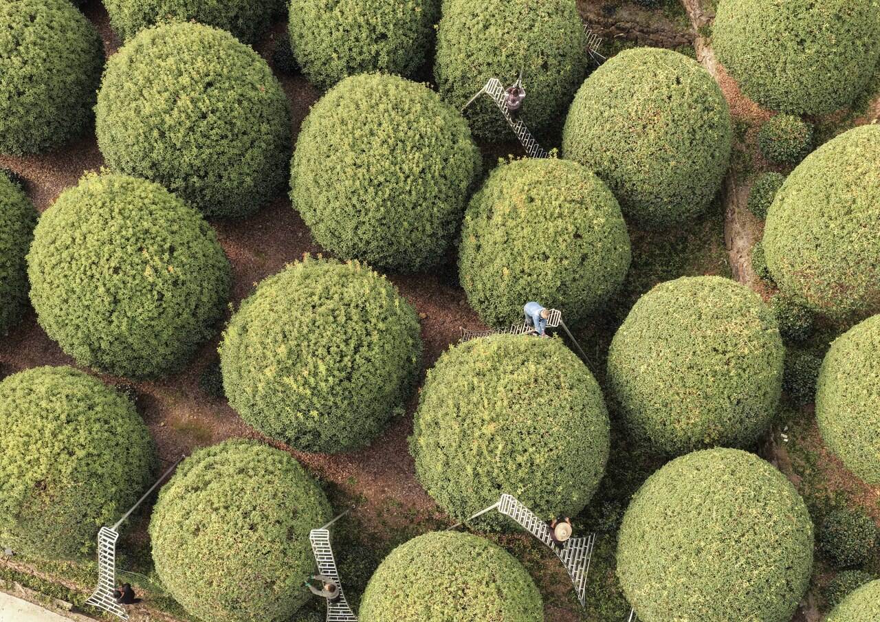 近日,杭州余杭区桂博园内种植桂花树8000余棵,包含丹桂、金桂、银桂等品种,其中丹桂因色泽艳丽被游客形容为“肉松球”。据了解,天气转凉后,桂花进入缓慢生长期,工人也开始了最佳修剪期。工人登上高梯修剪球形桂花,一位工人每天可以修剪七八棵桂花。