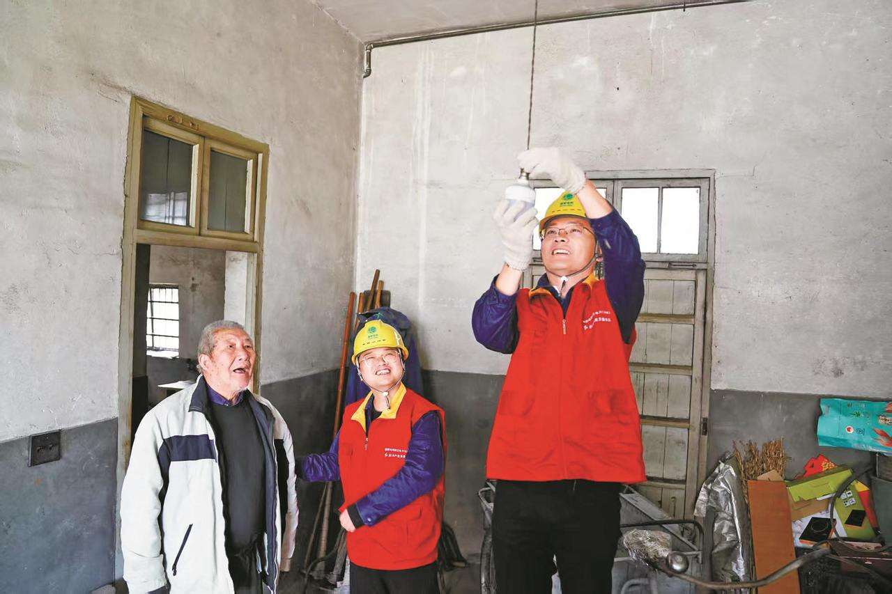 电力工作人员为老人换灯泡(吕洪波摄)