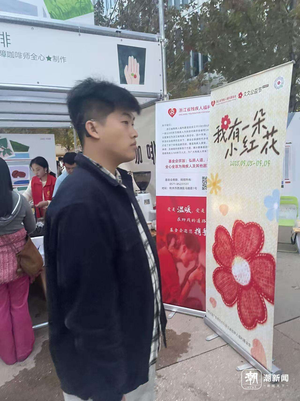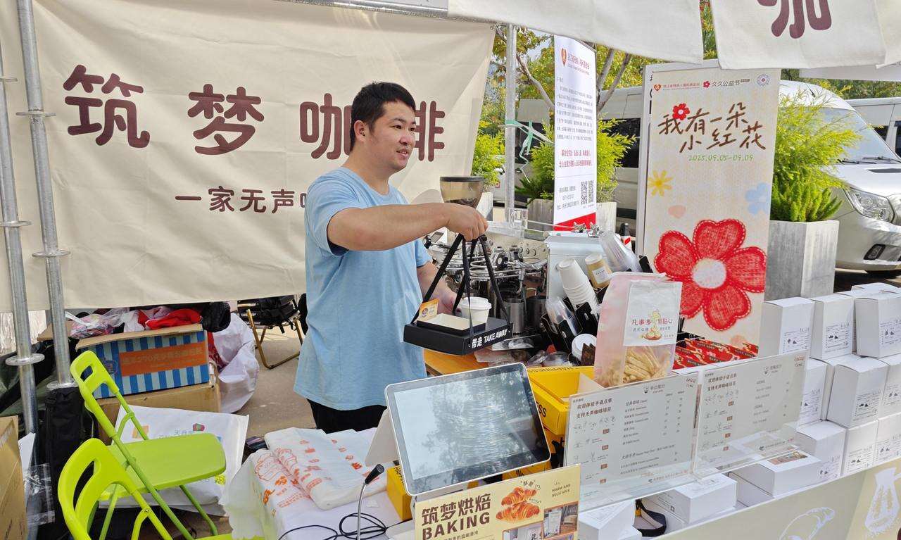 因为主办方的照顾,筑梦咖啡的摊位号是1号,就在咖啡节的入口处,并不难找。浙江省残疾人福利基金会的展板前,有人停下了脚步。
