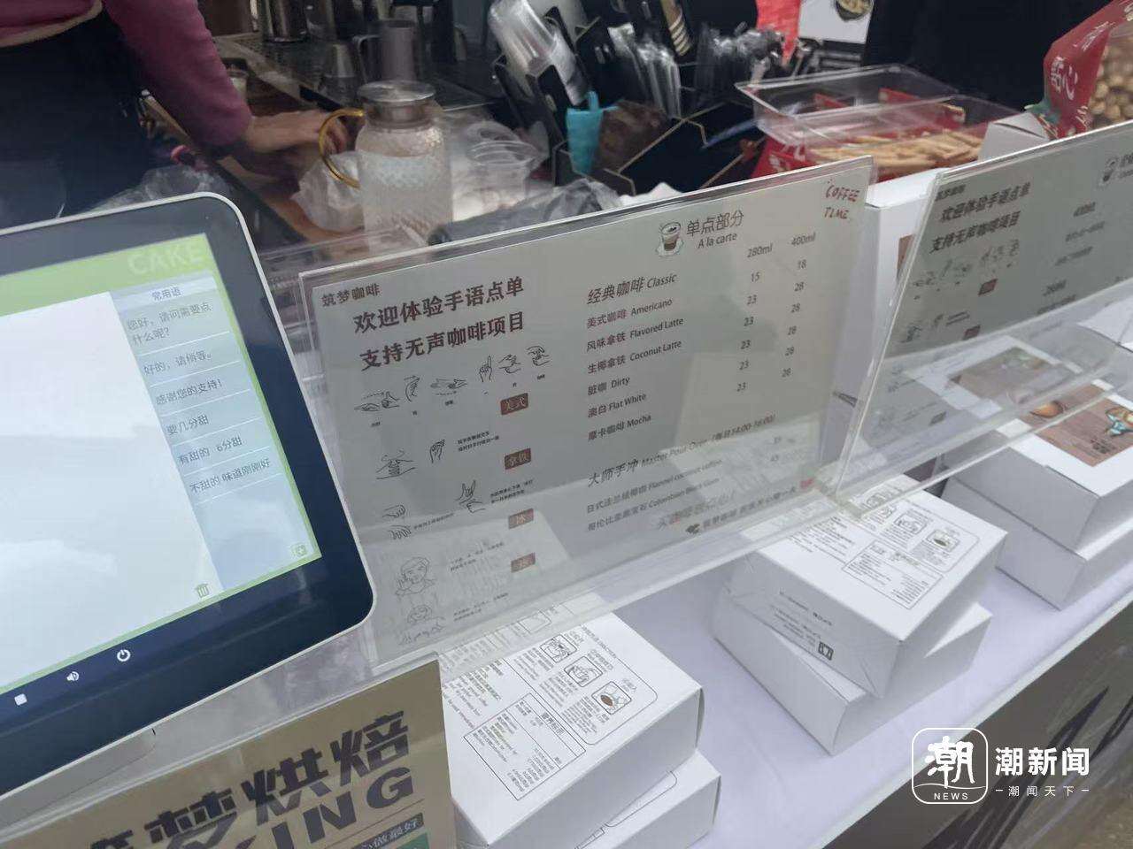 这里不说欢迎光临,不要求扫二维码加微信,他们通过一杯杯无声咖啡、一次次手语对话联结彼此。有年轻人等待的间隙,对着展板上的教程,现学手语,为女友点一杯她最爱的咖啡。