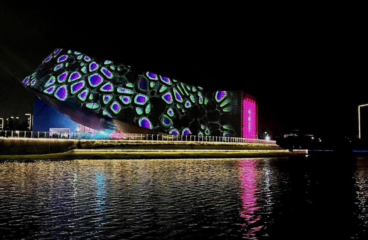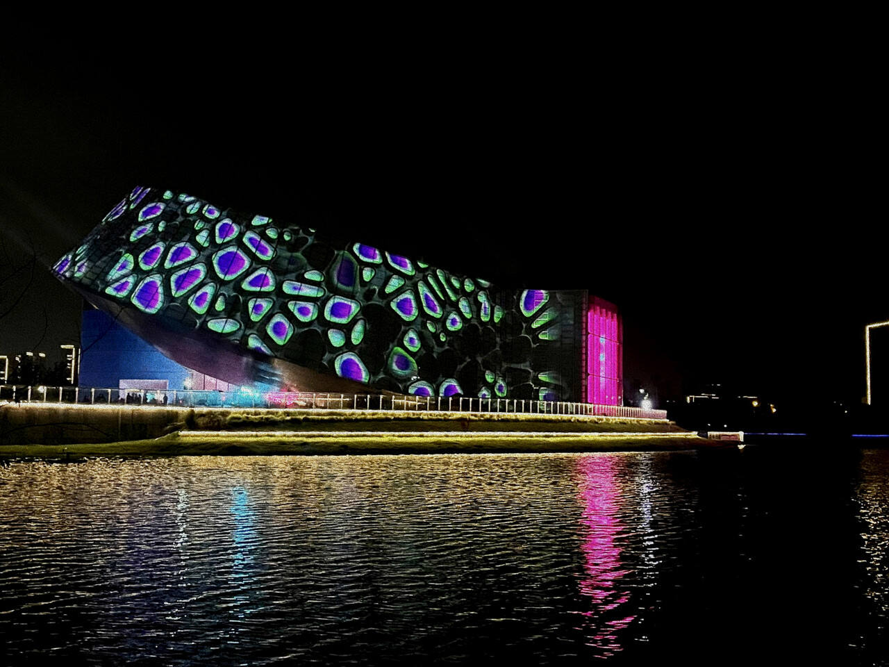如果大家下午去看展,也有进一步在玉湖闲逛的计划,也不妨等到天黑——余杭美术馆馆体的外立面采用了玉石玻璃和铝板的创新结合,在双年展期间,展馆立面夜晚时分会呈现360°动态投影。