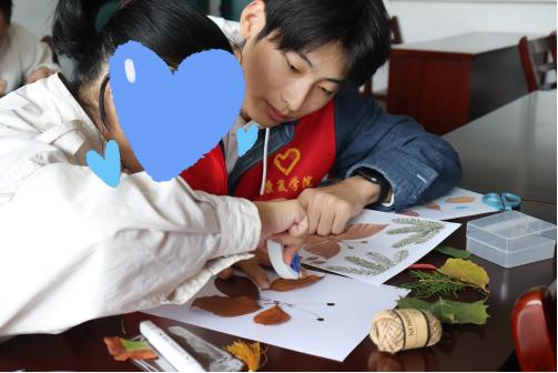 在“贴秋”手工课堂上,志愿者带着孩子们来了一场寻找秋日脉络的奇妙探索,旨在通过各种各样寓教于乐的游戏,增强孩子们对外界环境的感知,针对性提升手眼协调与精细操作能力。