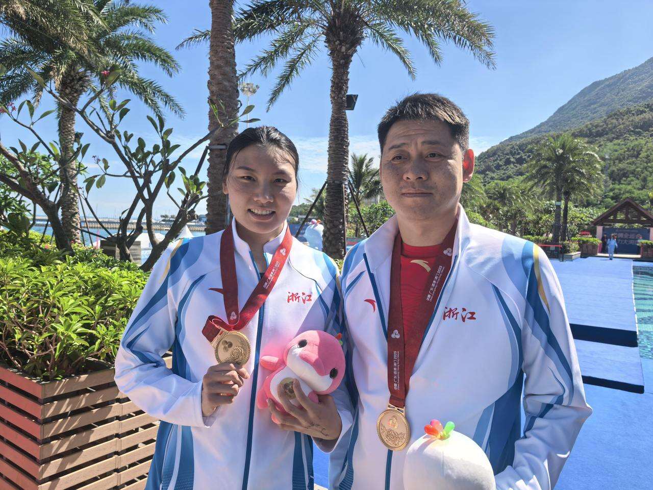 柳雅欣夺冠后与教练郑坤良合影。图片来源:浙江体育职业技术学院