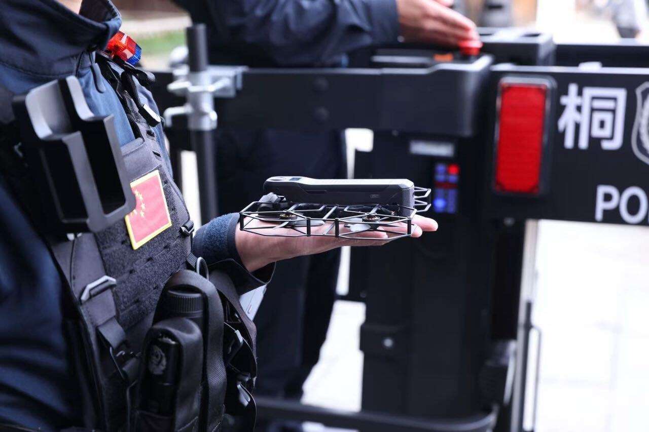 空中,伴飞式执法记录仪在低空缓缓飞行,桐乡市公安局乌镇派出所PTU辅警钱仲琪说,国庆时木桥游客稠密,全靠这“空中之眼”传回画面,地面队员才能快速疏导。街头执勤的铁骑队员穿着智能温控背心,就算在江南湿冷的天气里,后背和颈部也始终暖烘烘的,他们笑着说:“有了这‘小太阳’,再冷的夜巡也不怕。”