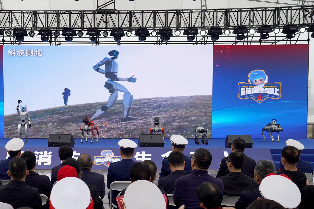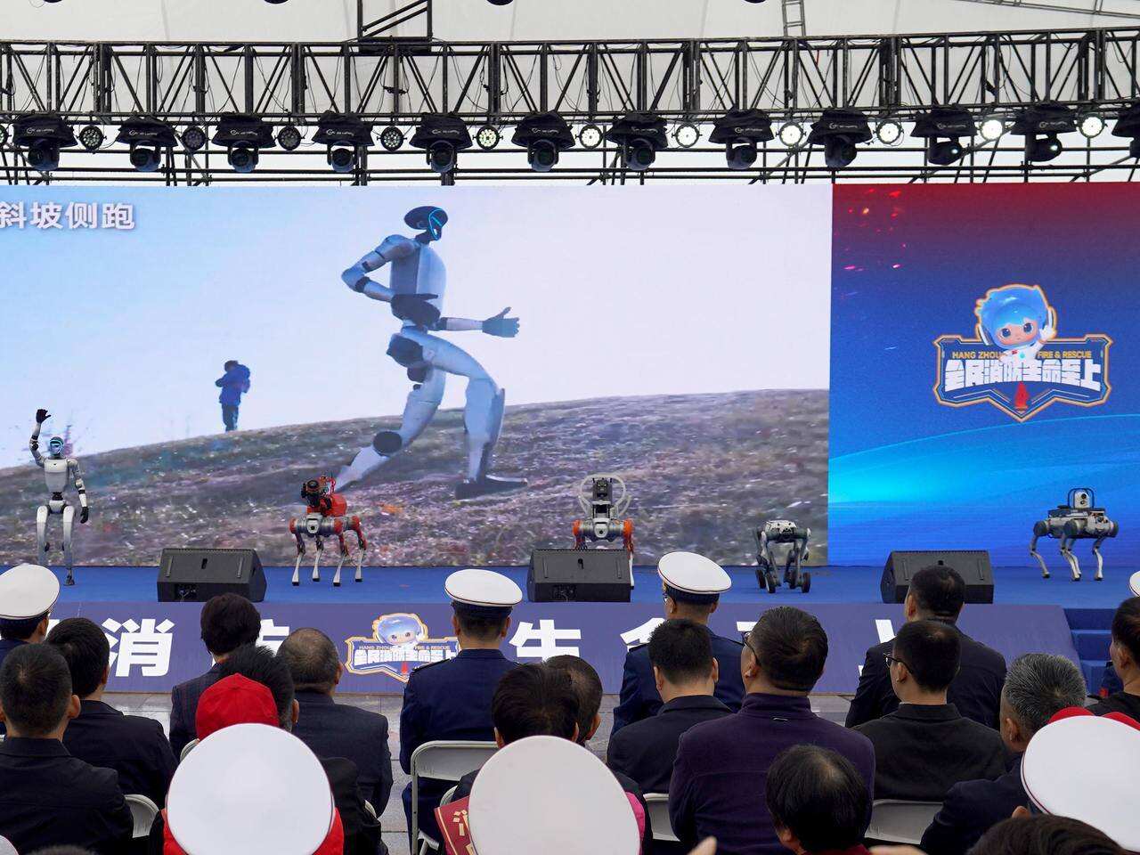 启动仪式上,由宇树科技、云深处等科技公司研发的智能机器人组成的“消防尖兵团”走上舞台。“未来这些‘钢铁勇士’将与消防员们一道逆行进入各类救援现场,甚至在极危险的救援环境中替代消防员,完成各项救援任务。”杭州市消防救援支队后勤装备处工作人员许洋说。