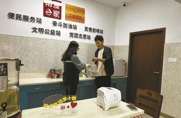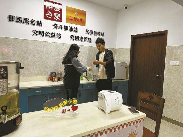 聚贤社区则以“甬爱e家”为阵地,打造有温度的“暖心加油站”。一早,网格员庄碧宇就熟稔地招呼起快递员:“戴哥,件多辛苦,有空进来歇歇脚!”服务点内暖意融融,热饮、泡面、充电宝等物资充足,休憩区整洁舒适,网格员全程化身“贴心管家”,为一线“小哥”补充能量、缓解疲惫。