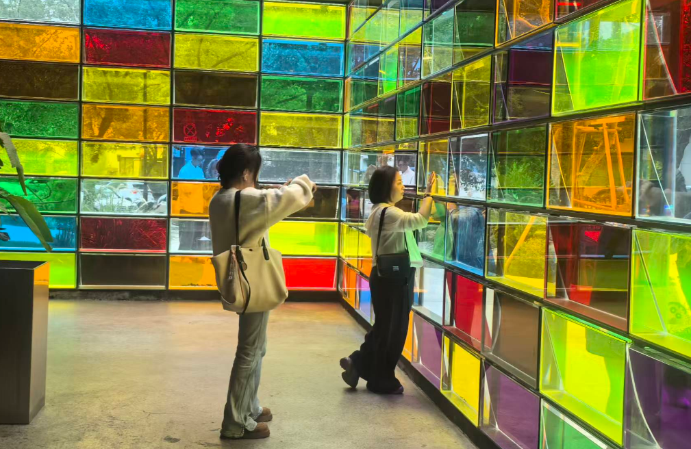 在现场,记者遇到了不少像王建设这样举着专业设备、手机拍摄的市民,穿牛仔外套的姑娘倚着彩色墙,手机举到胸口找角度;戴黑框眼镜的小伙蹲在地上,镜头对准墙面与地面交界的光斑;倒是一旁想上厕所的阿姨犯了难,担心去往卫生间会误入别人的镜头,便在边上等了4分钟。
