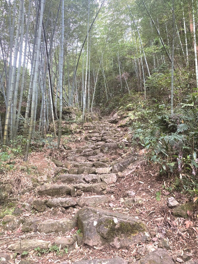 从山脚上山,走百来个台阶后,石阶变成规则不一的石头,越往上走越陡,两侧都是竹林,偶尔传来鸟鸣和潺潺水流声,周围非常寂静。