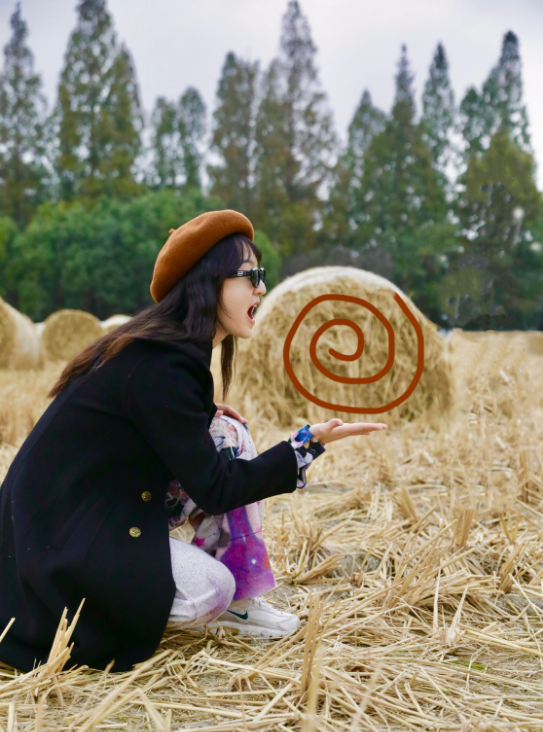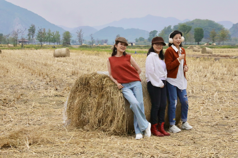 站在田间向远处眺望,“瑞士卷”与不远处的水杉、村舍、山影交织成一幅静谧的秋日画卷,有人用手推着草垛,还有人爬到草垛上方,摆起了pose。