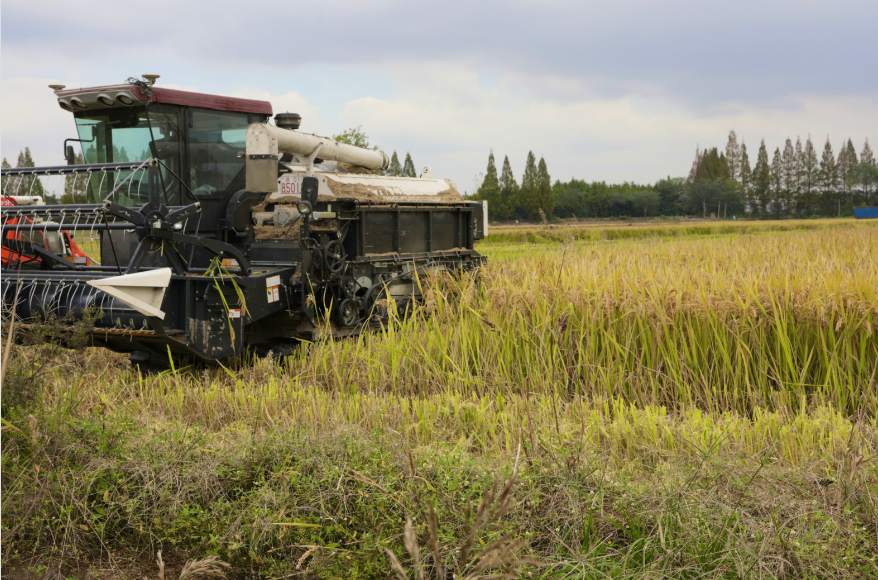 从双浦吴家渡口登船,约5分钟即可抵达对岸的长安沙岛,“西子田园·有稻里”生态示范园(下称“示范园”)就在岛内核心区域。示范园的稻田里,春诚优887号水稻谷粒金黄,收割机在地里来回穿梭,收割、脱粒、吐秆一气呵成。