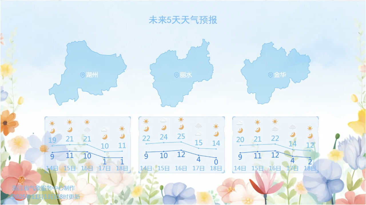 据省气象台预报,接下来我省将开启一连串好天气,气温也随之缓和,一直到16日,最高气温20℃以上的区域将增多,如丽水16日有望达到25℃。