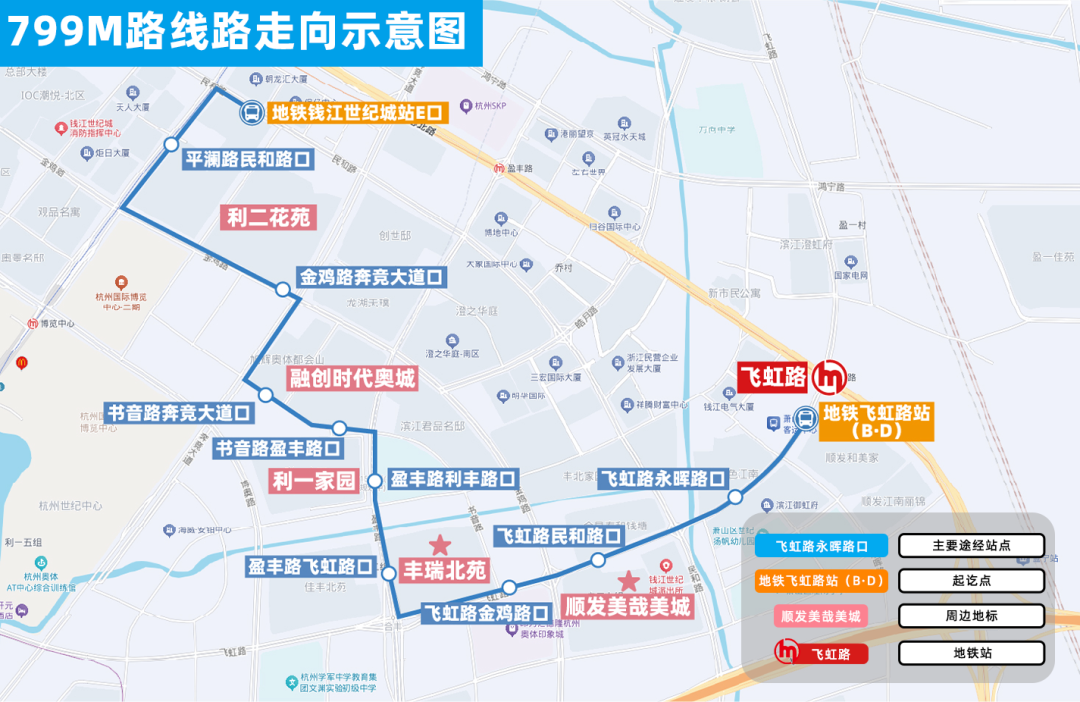 乘客可乘坐该线路至地铁钱江世纪城站换乘地铁2号线、6号线,或至地铁飞虹路站换乘地铁2号线,高效便捷的通勤方式让上班族出行更准时。