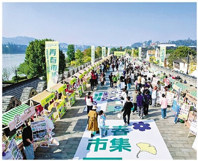 在梅城镇澄清门城墙上,青春市集热闹非凡。36个决赛成果展位、18个省级青年入乡实践站点与农业企业招聘展位、10个建德特色展位同场亮相。“第一次来到三江口,就被这里世外桃源般的景色和慢节奏的生活方式吸引,我们想为这里的乡村做点事情。”来自浙江树人学院的袁同学,已在建德三都镇注册公司,作为一名青创客,她正充满激情地向评委介绍自己与建德的“缘分”。