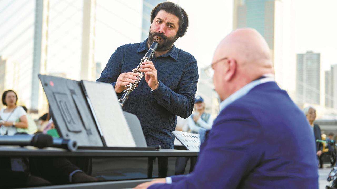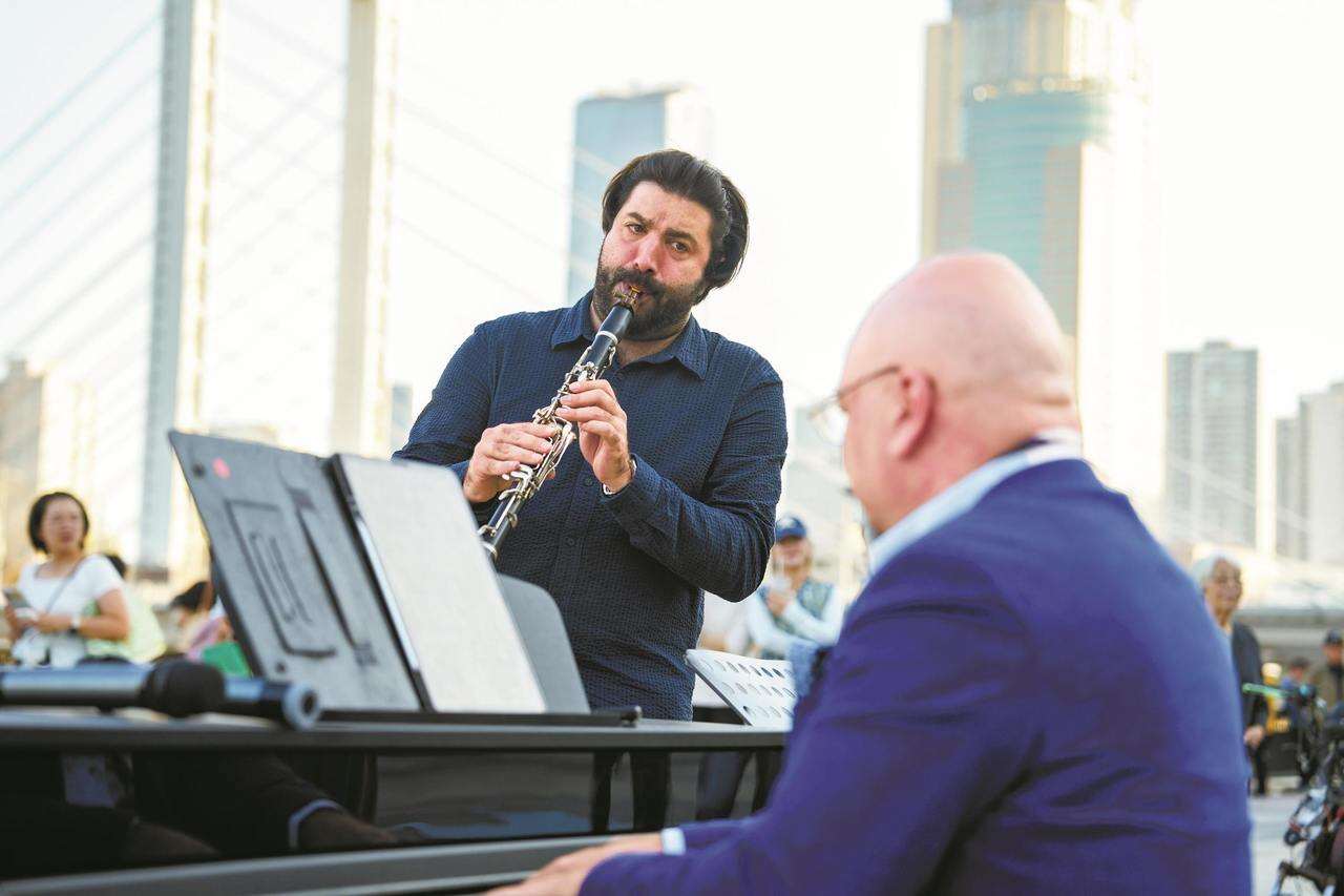 三人默契合作,接连演绎了《我爱你中国》《茉莉花》以及音乐剧《猫》的经典唱段《Memory》。悠扬的琴声、深情的演唱与典雅的管乐交织,迅速吸引了大量市民和游客驻足,不少人举起手机记录,在每一曲终了时报以热烈掌声,还轻声跟唱。