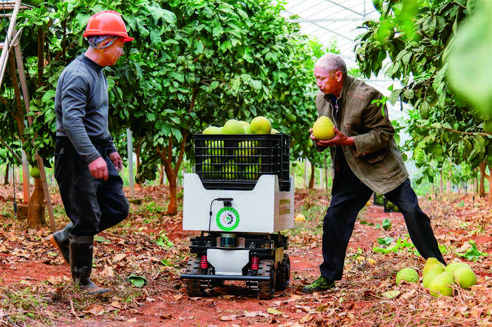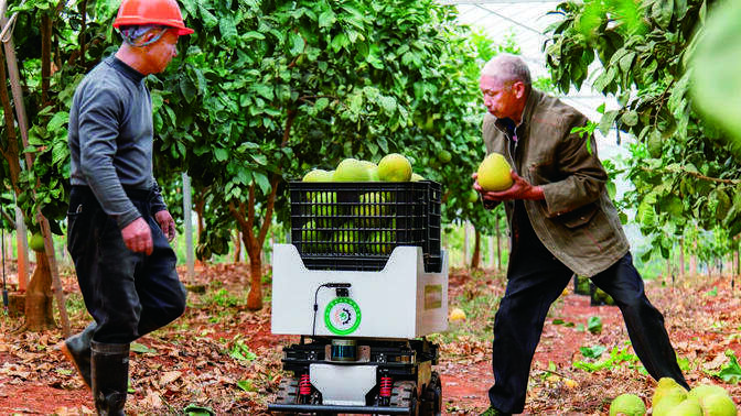 11月17日,婺城区白龙桥镇景迪生态农业基地水果大棚里,温室智能巡检搬运机器人在高低不平的田间平稳运行,搬运刚刚采摘的柚子。