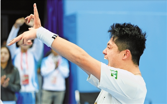 图为夺得全运会网球男单金牌的吴易昺庆祝胜利。 特派记者 王建龙 董旭明 摄