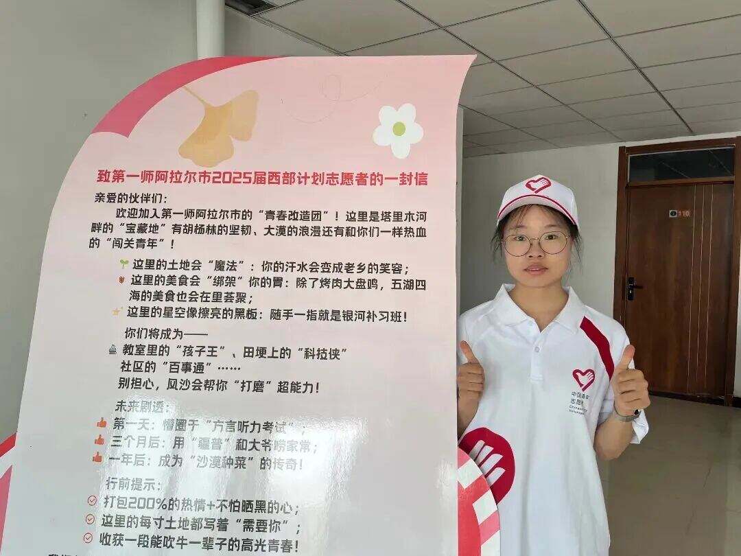 志愿感言:火车逐渐驶出熟悉的站台,窗外的风景一点点变宽。这片承载着千年丝路故事的土地,终将接住我们年轻的脚步。想象过戈壁的风会吹红脸颊,想象过教孩子们念 “大漠孤烟直” 时,他们眼里会映出怎样的光。或许会在某个星夜突然读懂 “奉献” 二字的分量。我知道此行不是冲动——是被无数默默奉献的身影感召,是渴望在祖国最辽阔的画布上,用青春画下属于我们这代人的笔触。期待在戈壁滩种出绿苗,在课堂里播下希望,让青春的脚印,和无数前辈一样,深深扎进祖国的西部大地。期待在这片被阳光吻得滚烫的土地上,让自己的成长,和边疆的发展同频共振。在铁轨延伸向远方的弧度里,藏着比课本更生动的答案——让青春在祖国最需要的地方,刻下坚实的年轮。