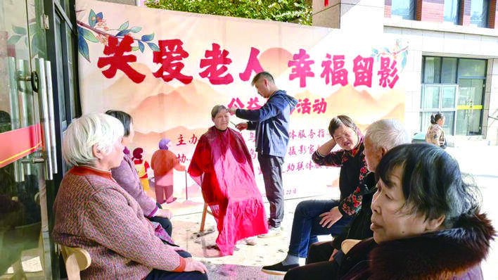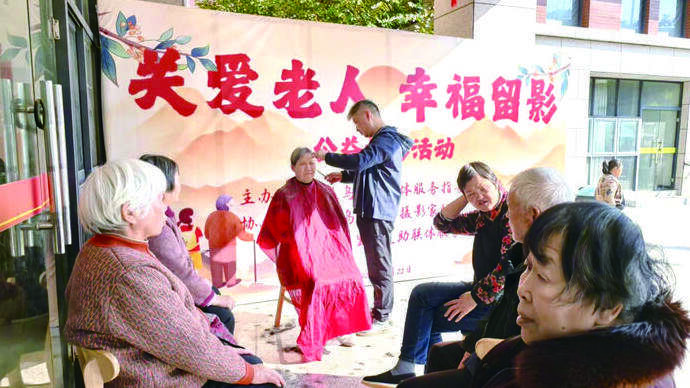 公益理发师阿东手法娴熟,为老人们修剪出利落发型。摄影家协会的会员们则化身“美好瞬间捕捉者”,他们耐心调整灯光,亲切引导姿态。
