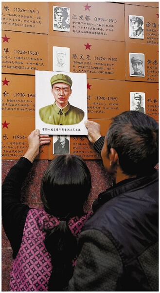 陈文元烈士的亲属将其彩色肖像画带到了常山县烈士纪念园烈士英名墙前。 通讯员 龚诚良 摄