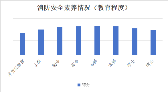 “市民报告”的部分,调查显示:市民消防安全素养与学历层次呈正相关,学历每提升一个层次,综合得分就会提高不少。不过有意思的是,“硕士”“博士”却在得分上略有下降。从报告中看,高学历人群在“消防安全知识”方面有所失分,但在“消防知识转化为消防行动”的得分会提高。专家分析,或许与高学历人群专注于学术或者研究,对一些基础的消防安全知识有所忽视。