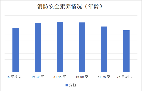 在年龄层级上,调查显示:“61 岁及以上”群体是核心薄弱人群,尤其“76岁及以上”群体在消防知识储备、消防安全意识和消防安全行动各维度的得分均显著低于其他年龄段。
