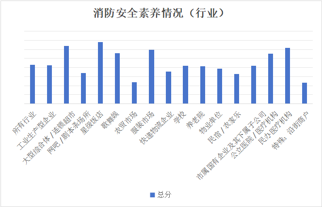 调查显示:星级饭店、民办医疗场所、大型综合体(连锁超市)、公立医院等行业单位从业人员消防安全素质整体得分较高。农贸市场、沿街商铺、网吧/剧本杀场等场所从业人员消防安全素质得分相对较低。