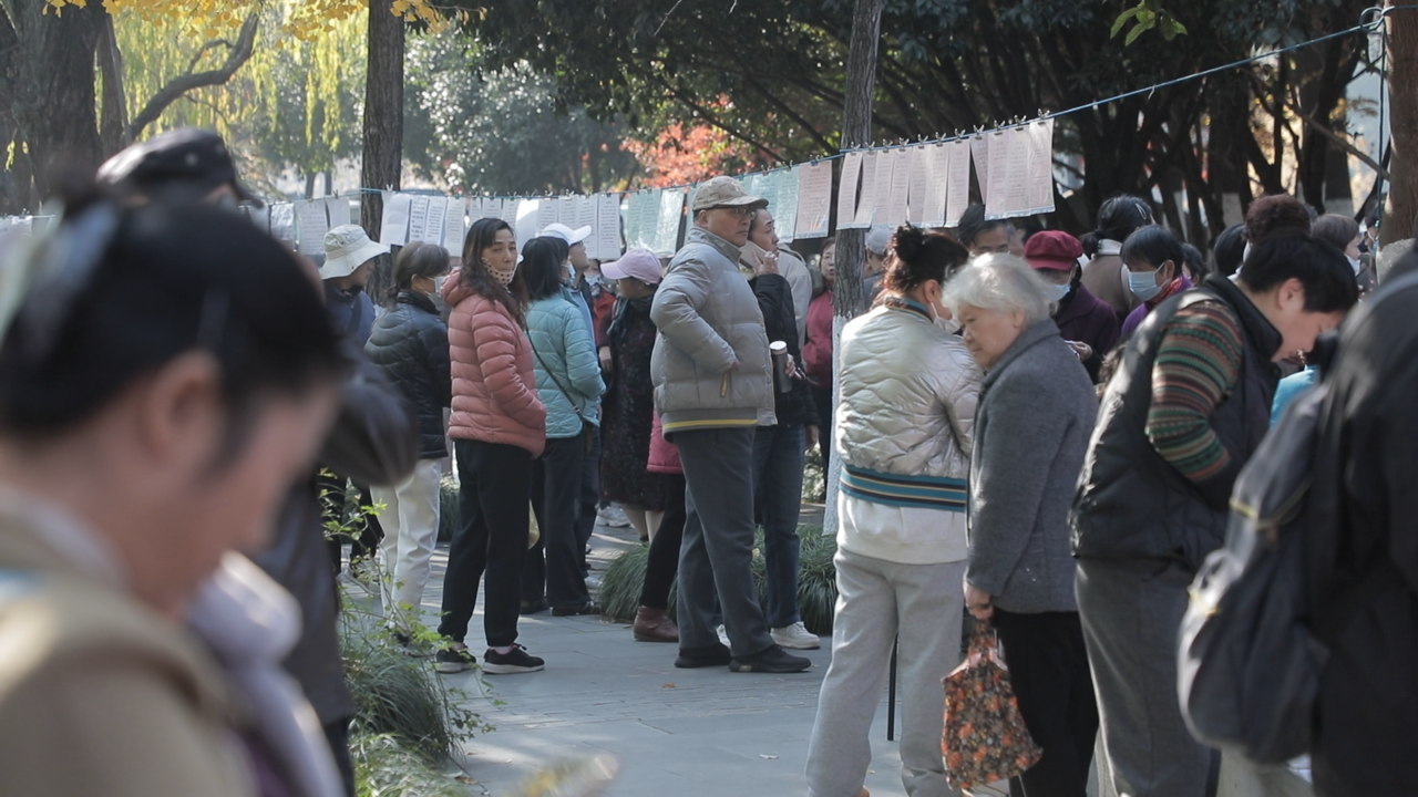 不大的公园内,过道已略显拥挤,草坪、花圃边、长凳上甚至伞面上,都贴满了红绿相间的相亲资料——红色代表女方信息,绿色代表男方信息。现场参与者以长辈为主,年轻人身影难觅,不少退休老人正戴着老花镜仔细查阅资料,低声交流着择偶标准。