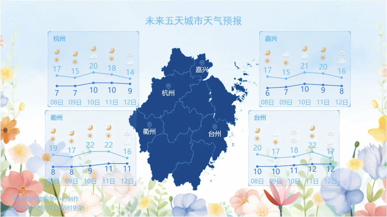 这波冷空气更是“来去匆匆”,很快,9日后期至12日受偏南气流影响,气温开始逐日上调,并冲击新的高点,部分地区又将超过20℃,同时,浙江上空云层变厚,沿海地区部分有小雨点缀。